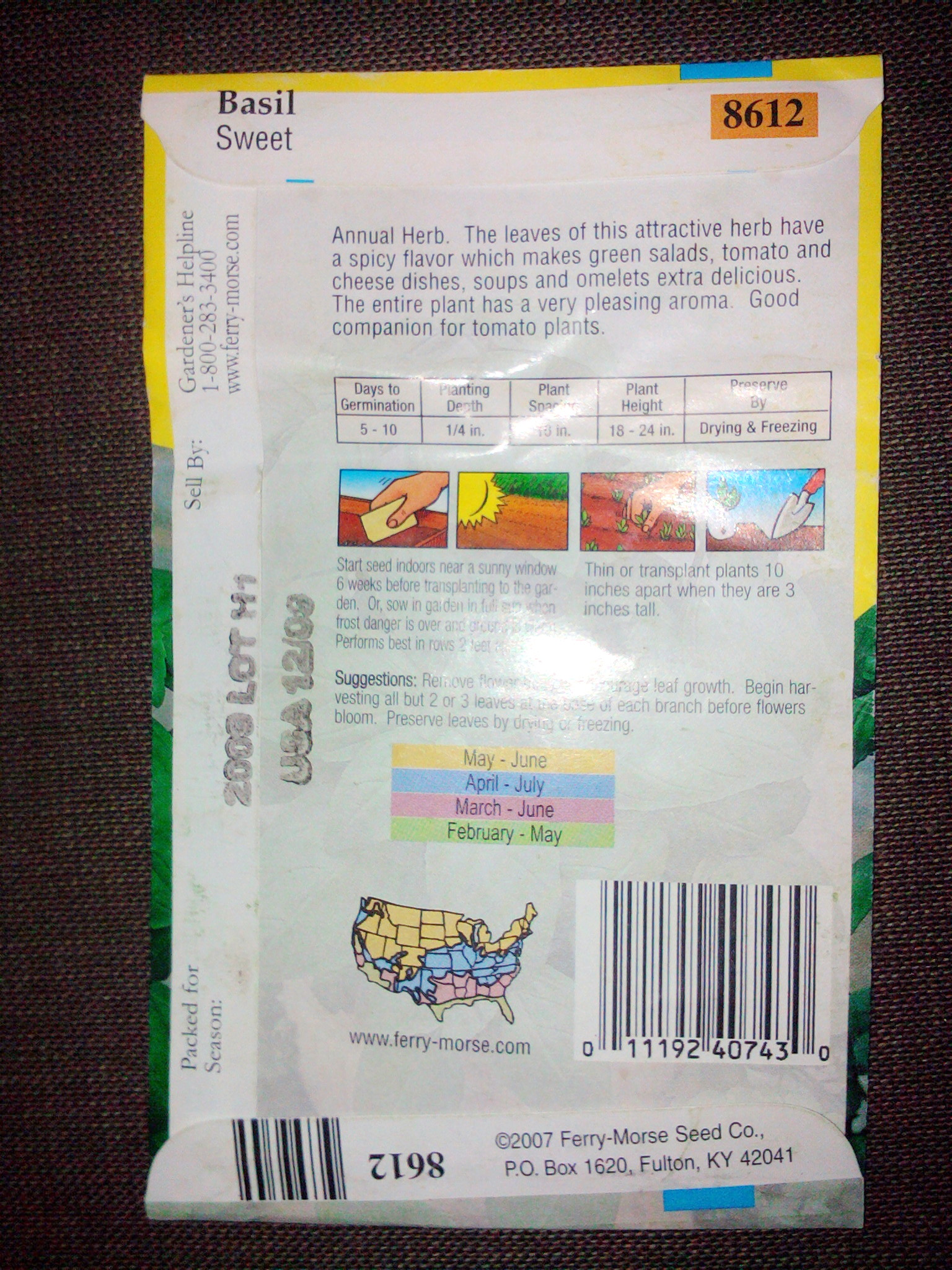 The package seeds come in contain good information about the seed variety inside. As much information that is included on the seed pack it is becoming more rare to see the listing of a hybrid or non hybrid. The terms described below identify if a seed is a hybrid, or an open pollinated variety. These codes will not always be in the same location on the pack and sometimes are missing altogether. Note in the picture the stamp on the left side of the pack signifies that this is a H1 hybrid Sweet Basil packed for planting in 2009.